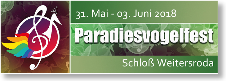 Vom 31. Mai bis 03. Juni 2018 gibt's auf Schloß Weitersroda Festivalflair und Live-Musik, den PizzaTank, vegetarisches Essen aus eigenem Anbau, die zweistöckige Mittelaltertaverne, einen Campingplatz, ein großes Feuer, großartige Menschen, jede Menge Kinder und jede Menge Musik.
